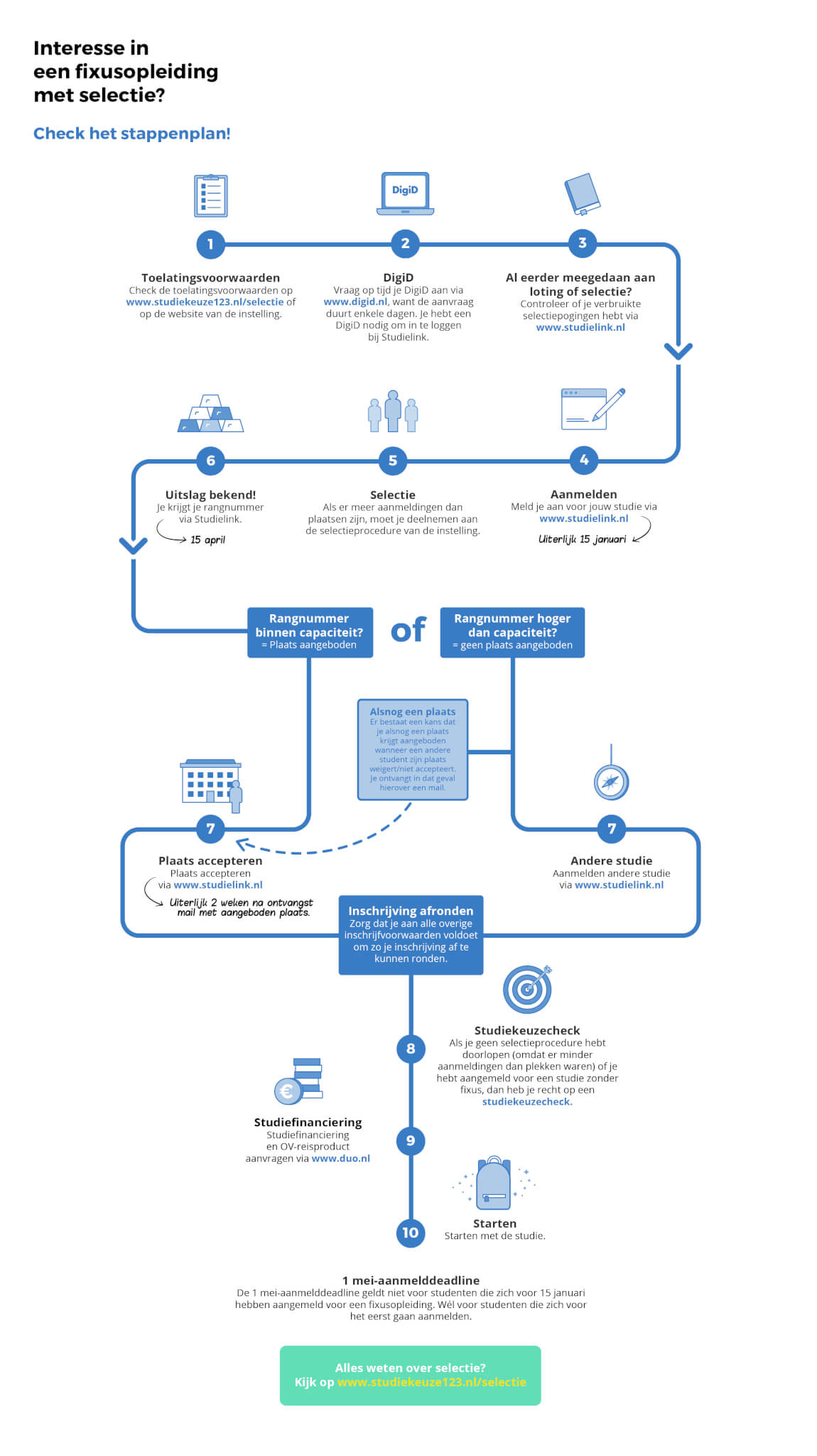 Wil je graag alle stappen en belangrijkste deadlines voor de numerus fixus graag op een rij zien? Download het numerus fixus-stappenplan (afbeelding, 64Kb) en bekijk de stappenplannen numerus Fixus op Studielink.nl.
